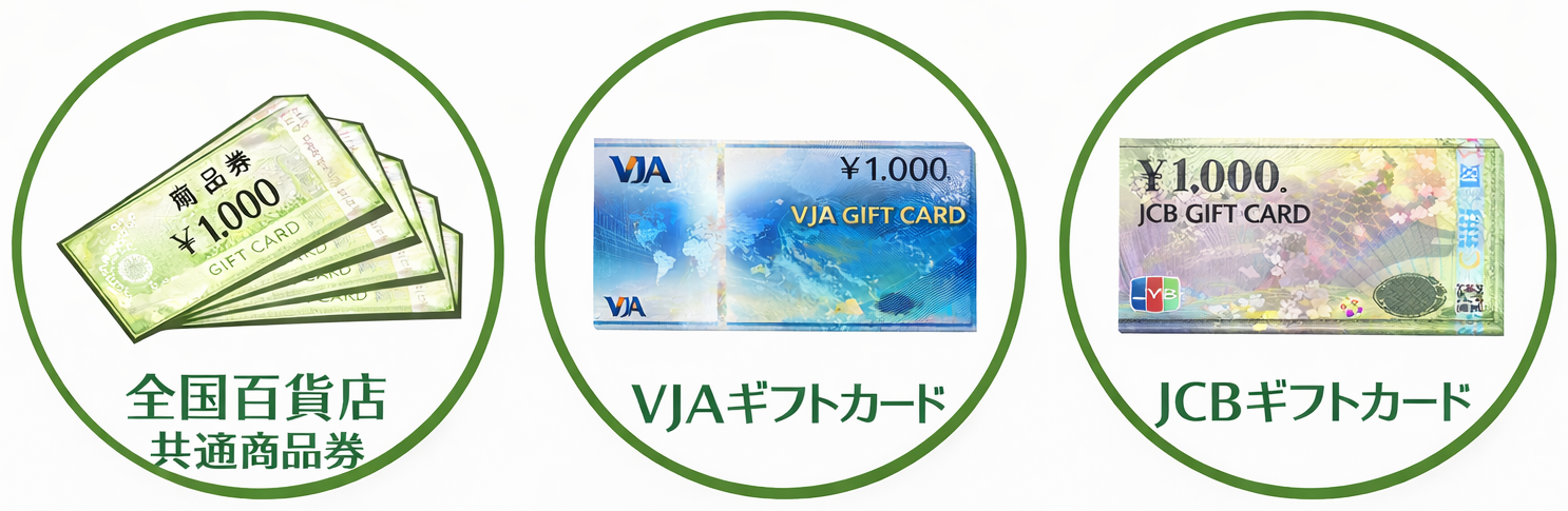 百貨店商品券やクレジットカード会社発行のギフト券・ギフトカードなど、